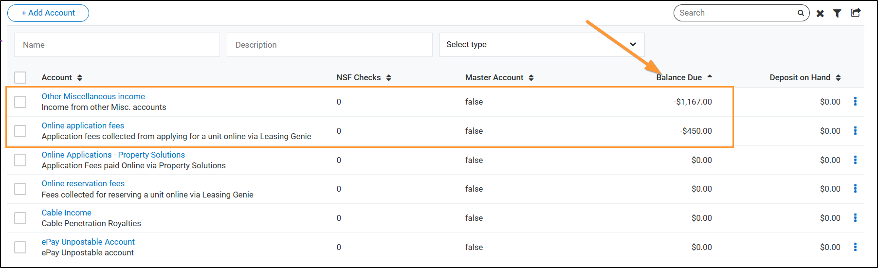 From here you can sort your ledgers by total - In this example we're going to look at the prepaid amount of $1,167.
