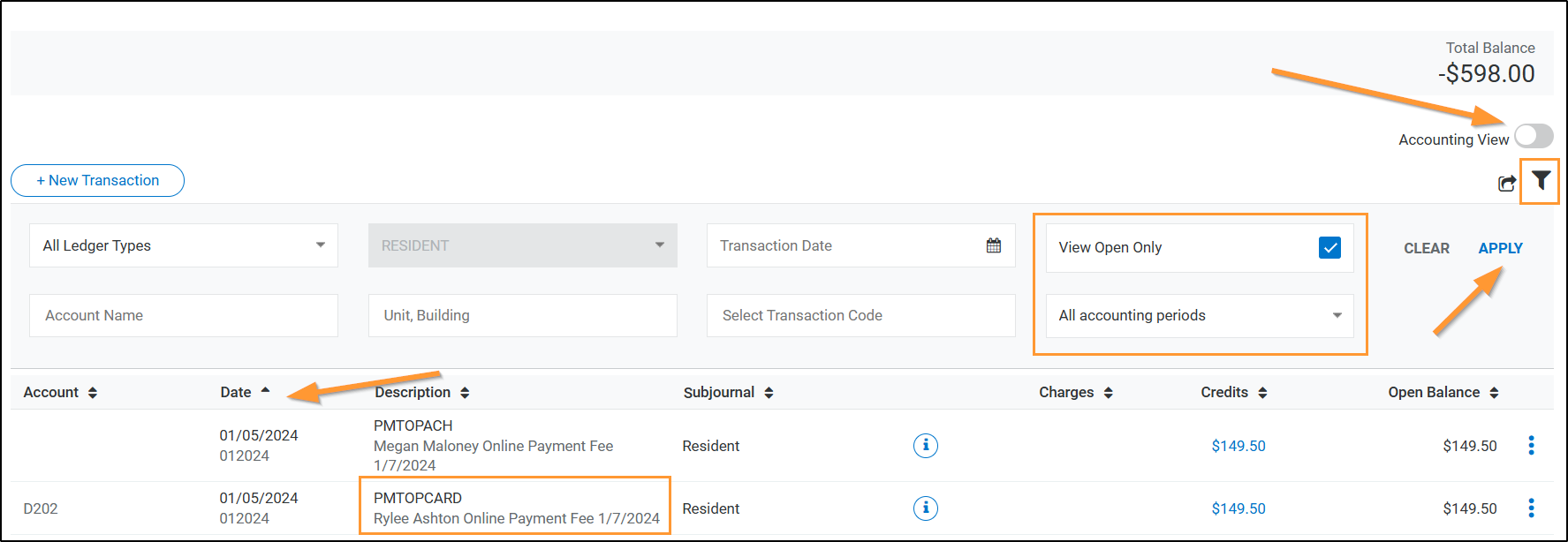 Toggle the Accounting View to Off > Click the Filter Option > Choose Open Only > Change Fiscal Period to All Accounting Periods > Click Apply > Sort by Date