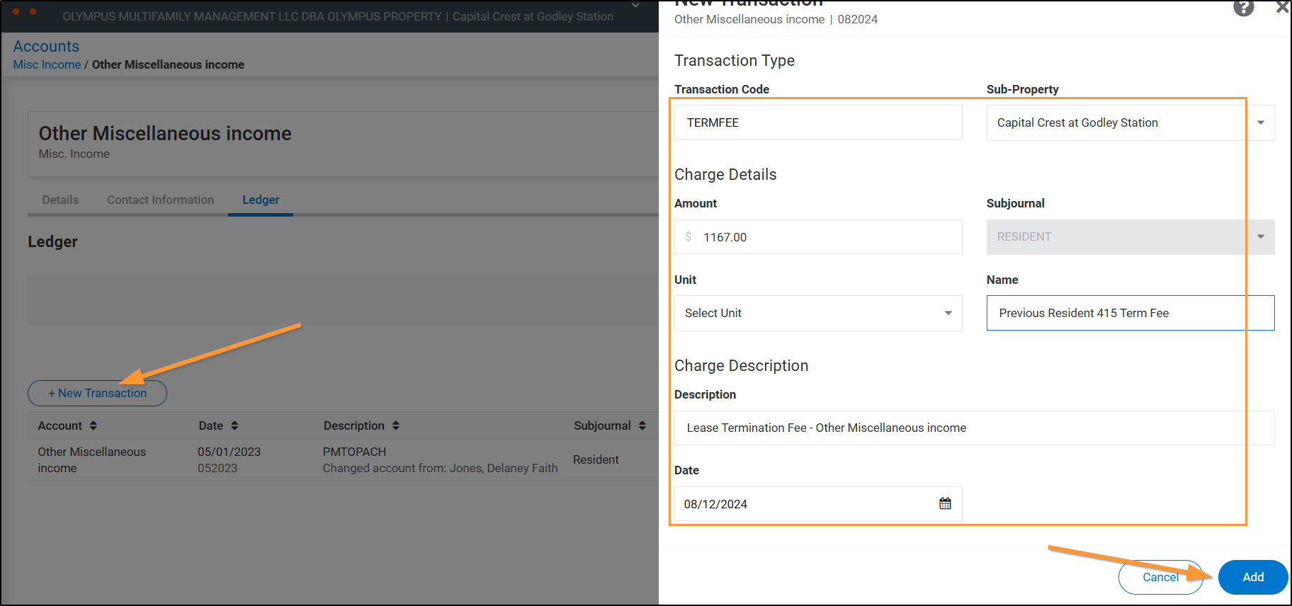 We can see that this payment was for a Termination Fee. This was likely paid shortly after taking over the property and this resident was not built into OneSite. We're going to charge this up to Termination Fee