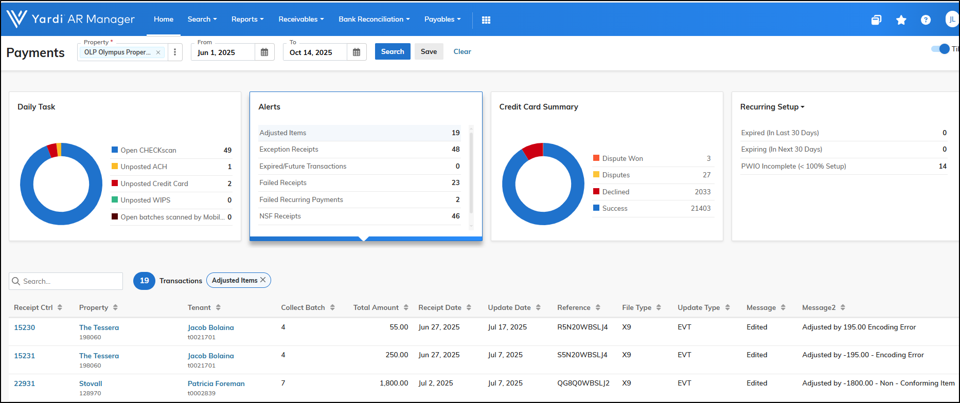 - [Action Item] - Failed Receipts - These are payments that posted to the residents ledger but there was an error with the image. These should be reversed, manually posted and deposited to the bank.